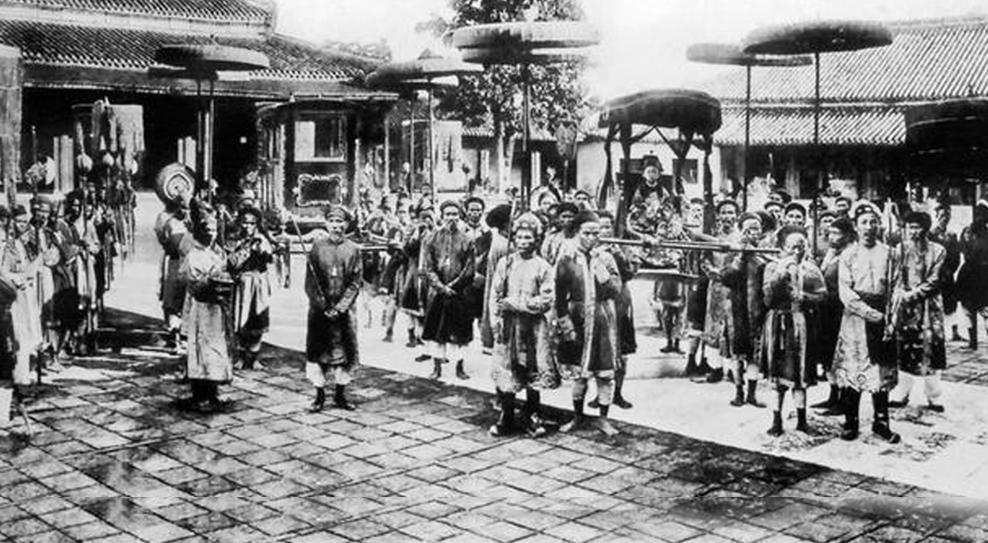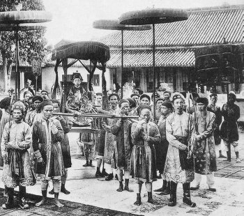 Le petit empereur d'Annam quittant ses appartements privés pour se rendre à la salle du Trône, porté sur une chaise de parade, entouré des mandarins du Conseil de Régence.
